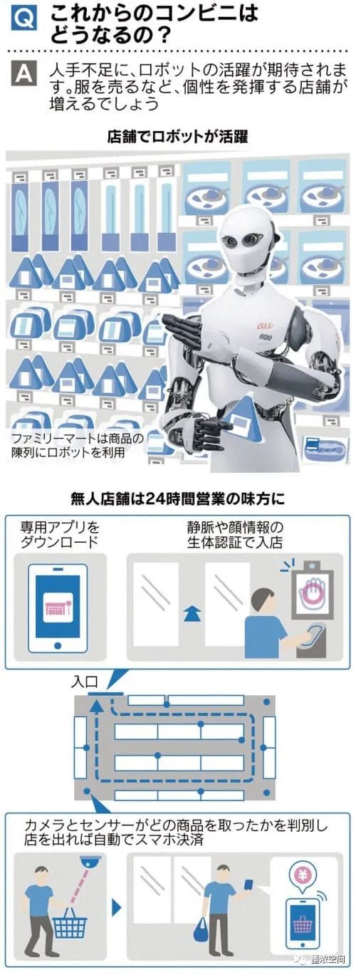 日本媒体预测,未来便利店的发展,一定离不开数字化转型,而这其中涉及到三个部分,即推进网上购物、增加网上购物的配送点、推进无人商铺。通过推进网上购物,来提前掌握需要进货的商品件数,从而提高商品的利润转化率。那么加盟店与总部之间所产生的强制买入商品问题,则可以得到缓解。而增加网上购物的配送点,则可以满足缩短营业时间所造成的营业额下降问题,通过增加贩卖渠道,增加每小时单位内的营业额,则既可以在不减少收益的情况下又避免了劳动时间过长的问题。而最后一点,推进无人商铺,日本媒体表示很期待未来机器人的投入使用以及结合无现金支付技术和自主购物的理念来实现该理念。